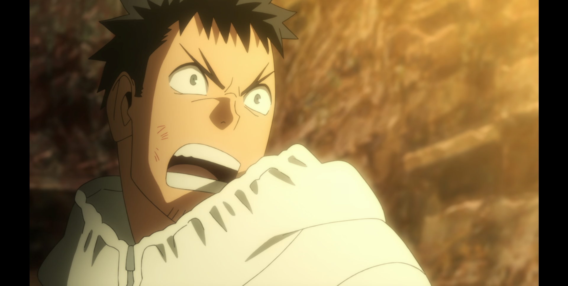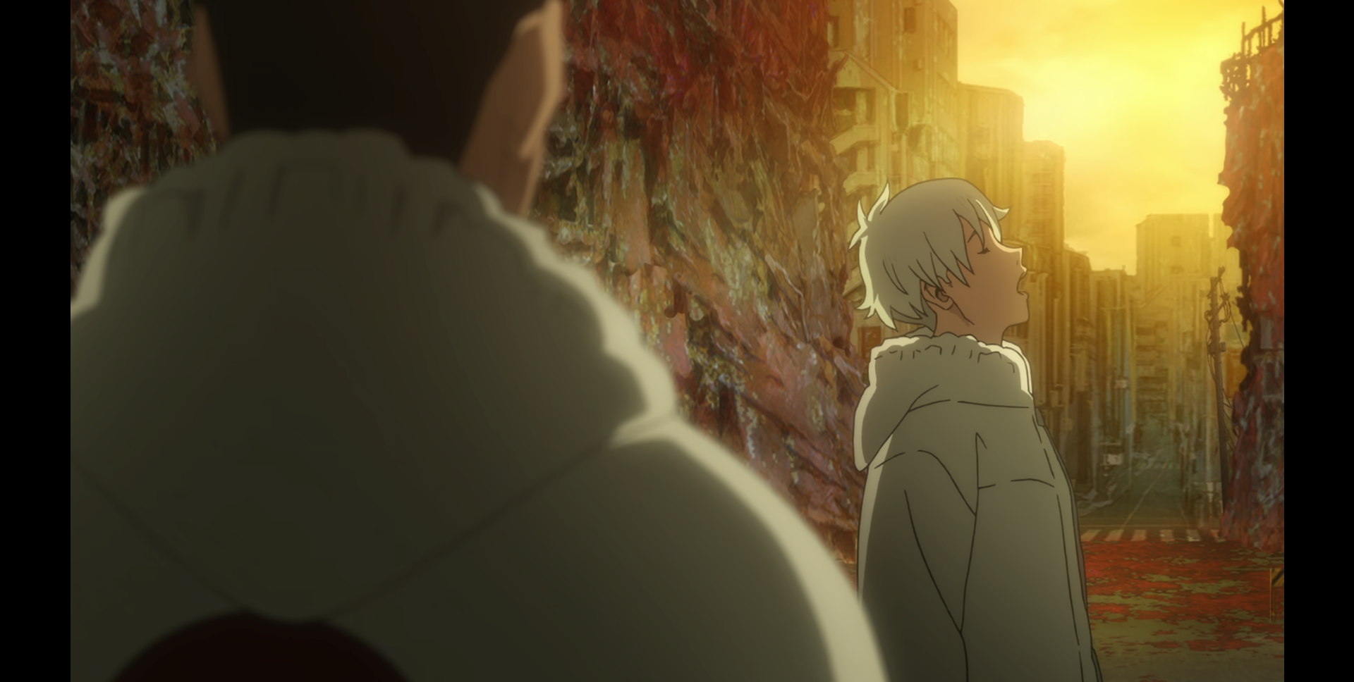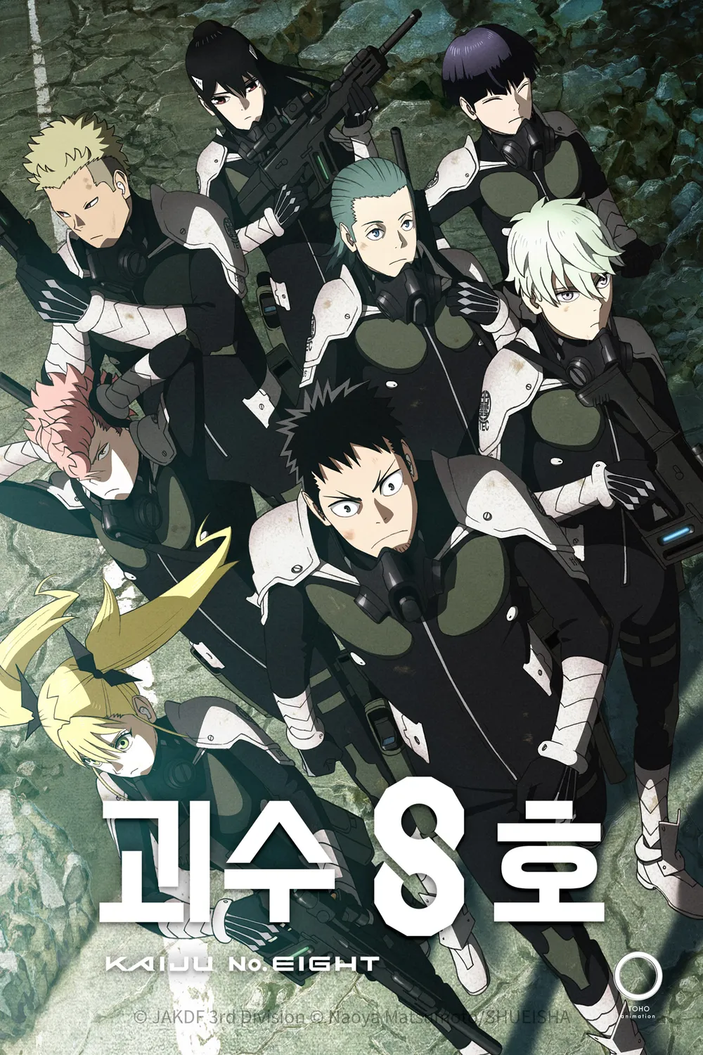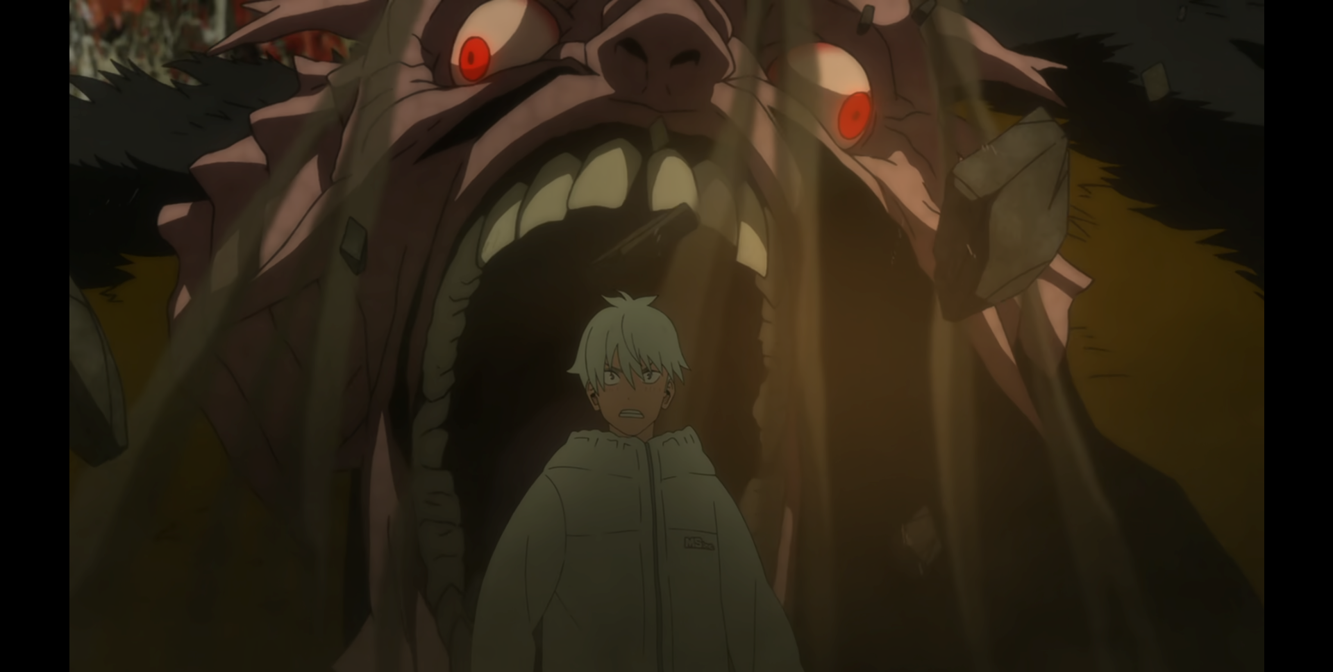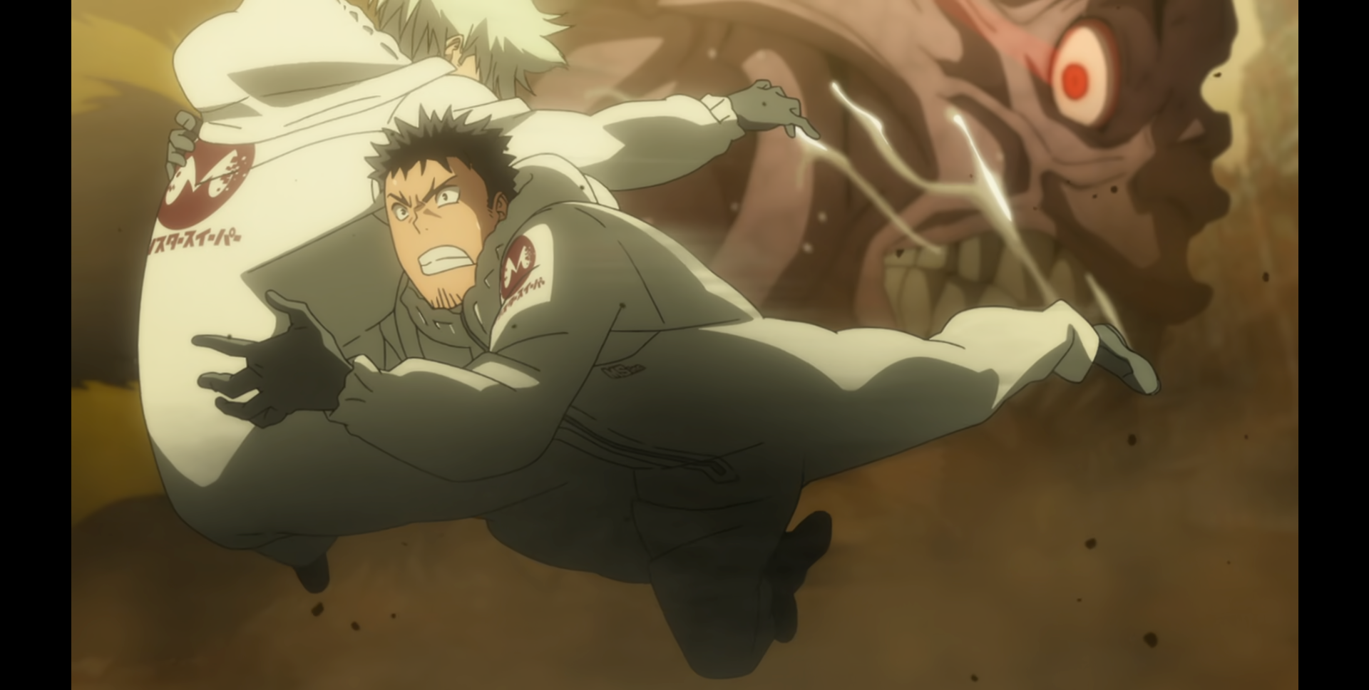 장면 예시는 애니메이션 <괴수 8호> 1화에서 이치카와 레노와 히비노 카프카가